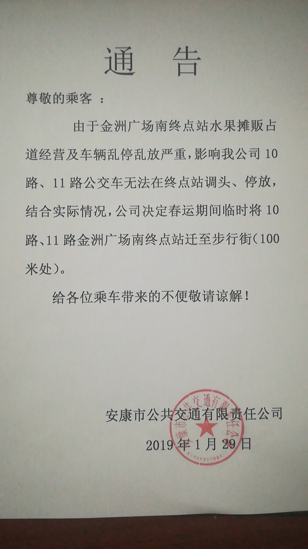 由于金洲廣場南終點站水果攤販占道經(jīng)營及車輛亂停亂放嚴重,影響我公司10路、11路公交車無法在終點站調(diào)頭、停放,結(jié)合實際情況,公司決定春運期間臨時將10路、11路金洲廣場南終點站遷至步行街(100米處)。